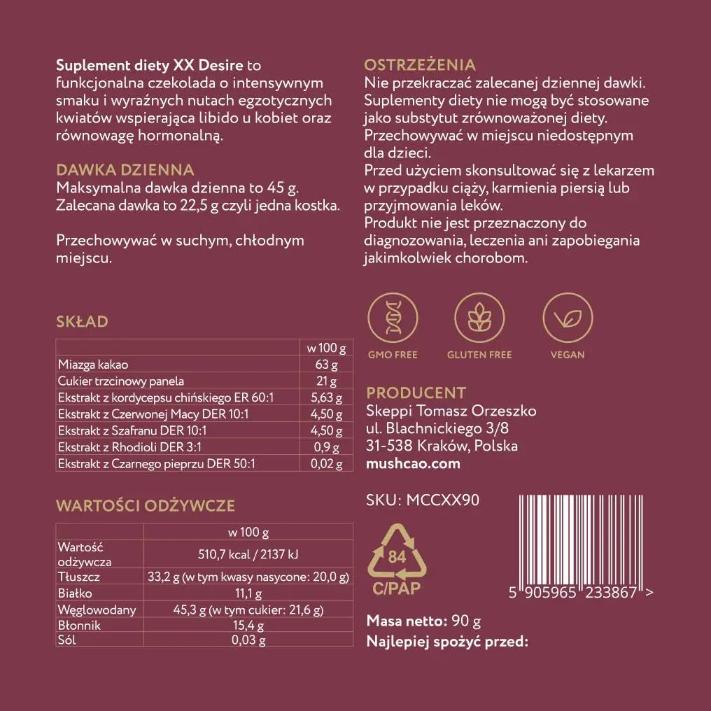 El suplemento dietético XX Desire es un chocolate funcional con un sabor intenso y notas pronunciadas de flores exóticas que favorece la libido en las mujeres y el equilibrio hormonal.
