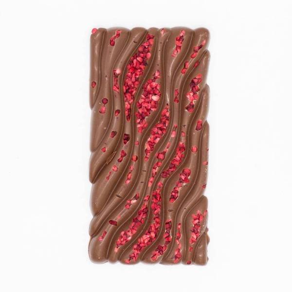 Основой нашей плитки является молочный шоколад высшего качества с гладкой консистенцией, который нежно тает во рту. Эта сладость является идеальным фоном для фруктовой добавки. Щедро добавленные лиофилизированные малины обеспечивают приятный хрустящий контраст и яркую кислую нотку. Лиофилизация позволяет сохранить все витамины и естественный, насыщенный цвет фруктов – шоколад не только имеет исключительный вкус, но и красиво выглядит. Гармония вкуса и визуальная привлекательность делают этот продукт фаворитом многих наших клиентов.